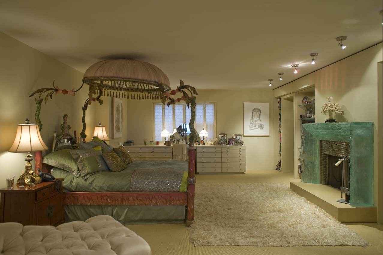 This is my bedroom. One-of-a-kind bed. There’s a mirror under that oval canopy with wooden tassels. I’m the only person I know with a glass fireplace! The light from the fire bounces off it and reflects and is gorgeous.