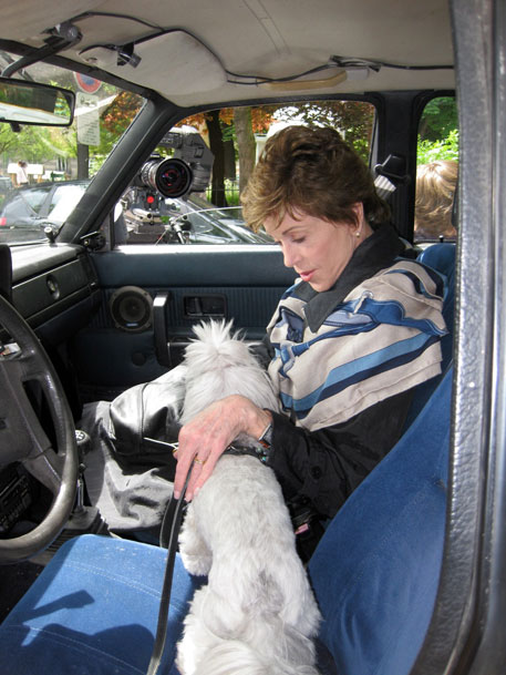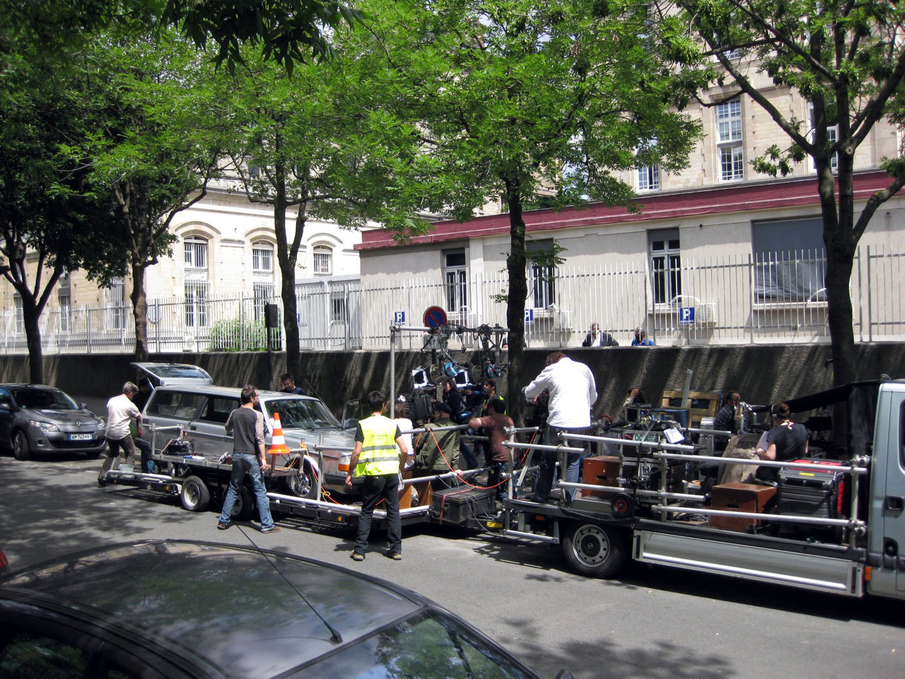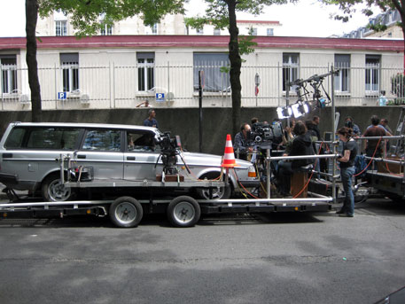I was too tired to write a blog last night so the photos I took yesterday are here. I wanted to show how we shoot car scenes…with the car mounted on a flat bed , the cameras attached in front and the whole is being pulled by another truck. This isn’t the only way to shoot car scenes but a common way, and, in our case, essential because Guy Bedos doesn’t drive. I would take Tulea into the car with me between takes cause she knew I was inside and whimpered when we went past.