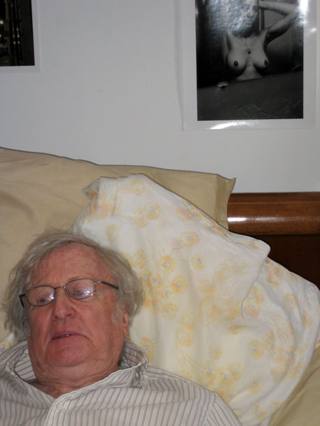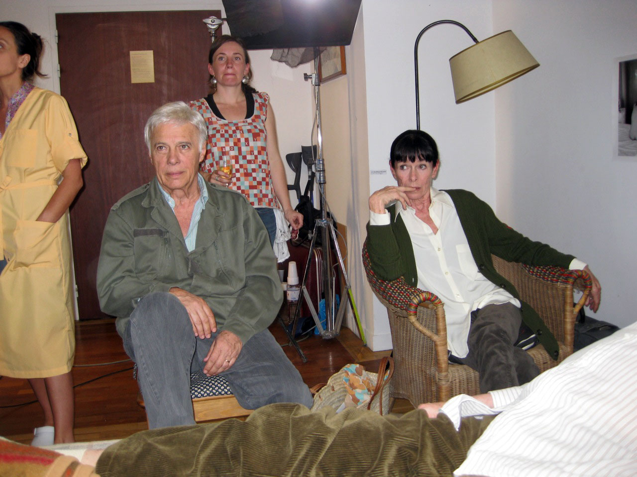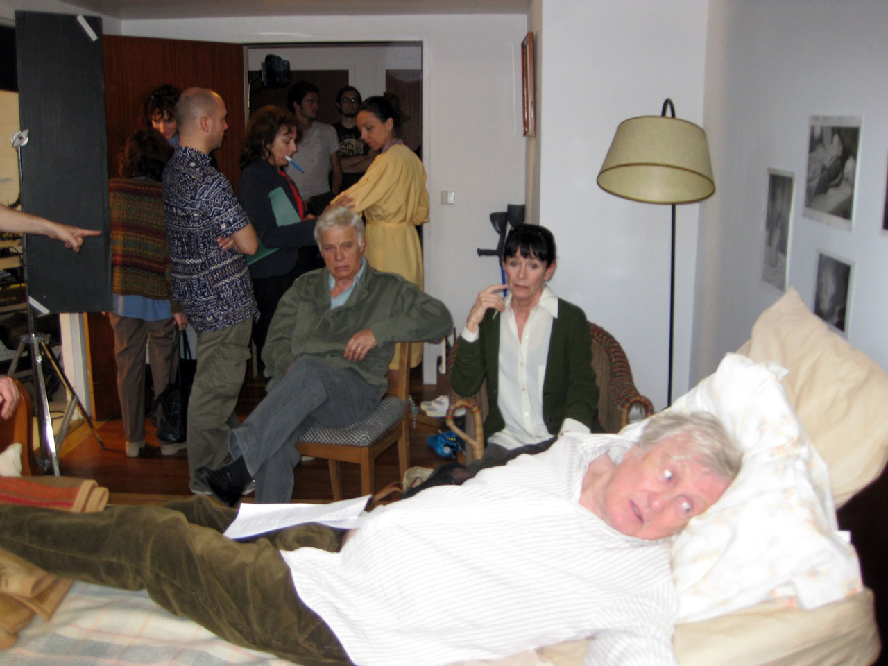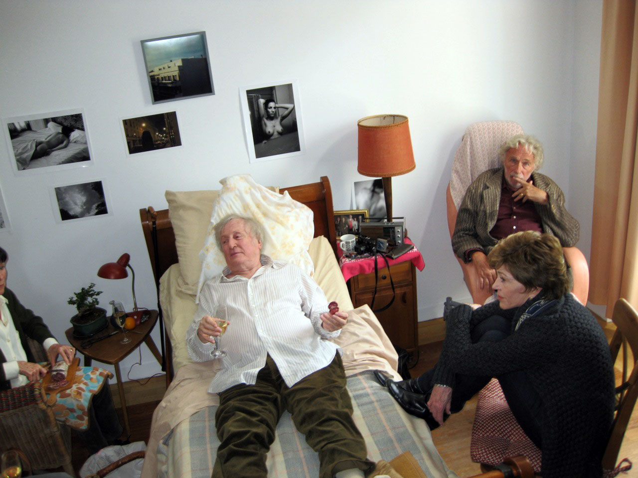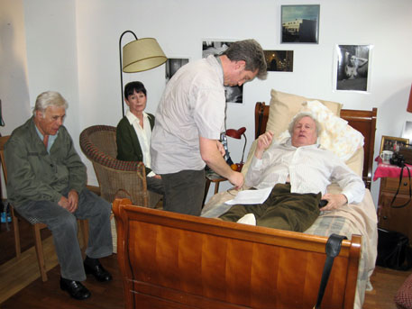 Today was the first day all of us shot together. Geraldine has been finishing a film in Spain so this was her first day on our film and it was a delight to work with her and look across the hospital bed at her awakened face, positively shining with spirit. She is an imaginative actor. I was impressed. In the scene, our friend, Claude (Claude Rich), had a mild heart attack and has been taken to a retirement home by his son and we, his pals, come to visit and decide, because we are not happy with what we experience in the home, to help him escape.