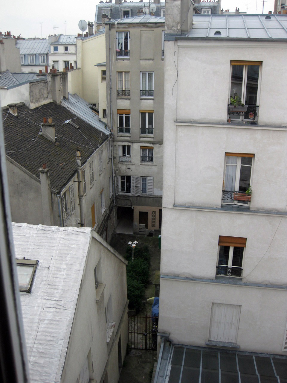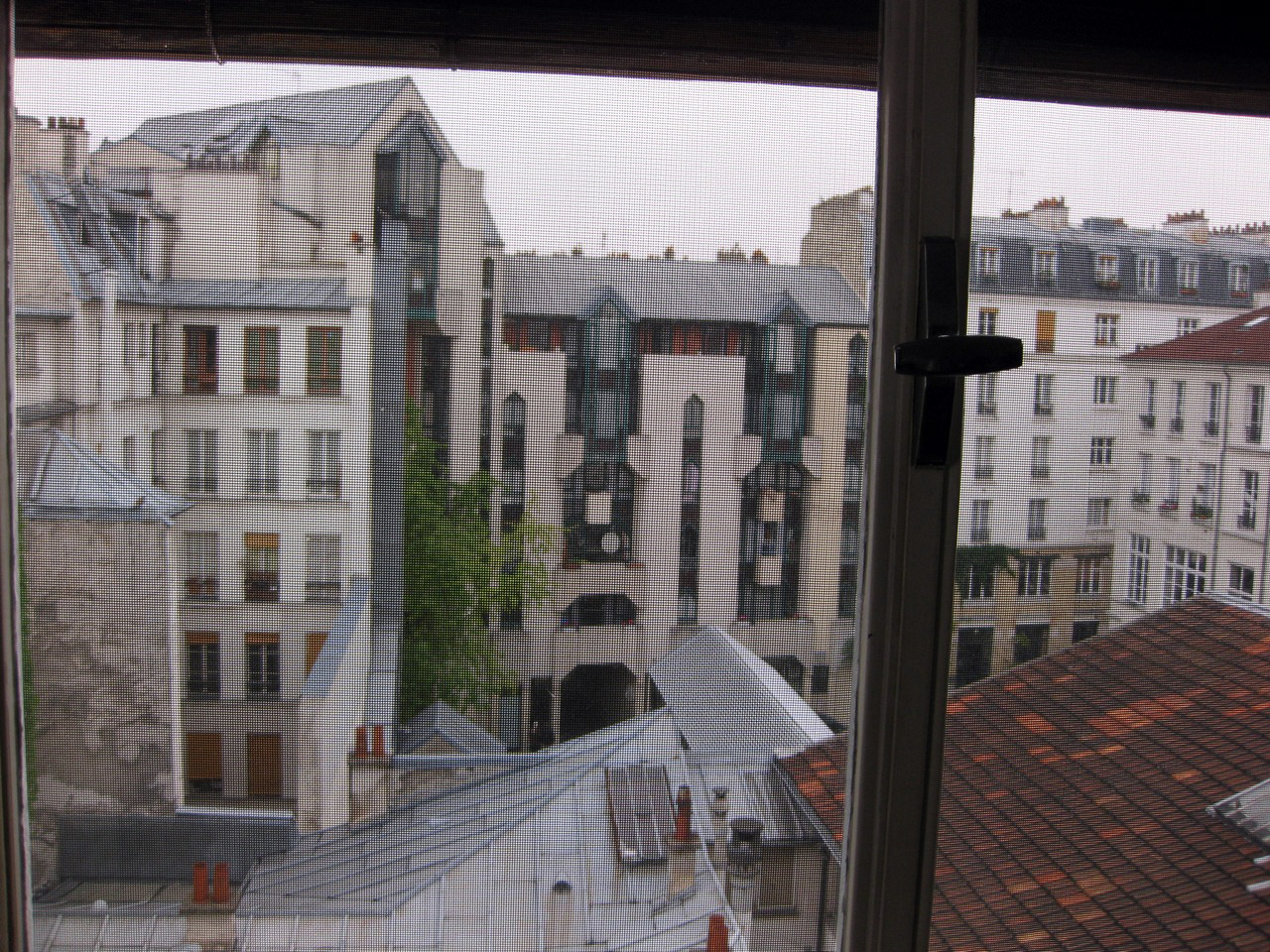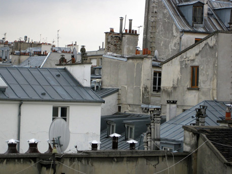 We’re shooting in an apartment within Paris where Pierre and I are supposed to live. We’ll be here all week. I can’t resist taking pictures of interesting roofs. Roofs are so different in different countries. You can tell the class of a particular neighborhood from the roofs. This one is “petit bourgeoisie”–lower middle class. I play a retired philosophy professor and so the 2 of us live on our pensions but it’s an apartment we bought years ago when we were earning more and costs were less.