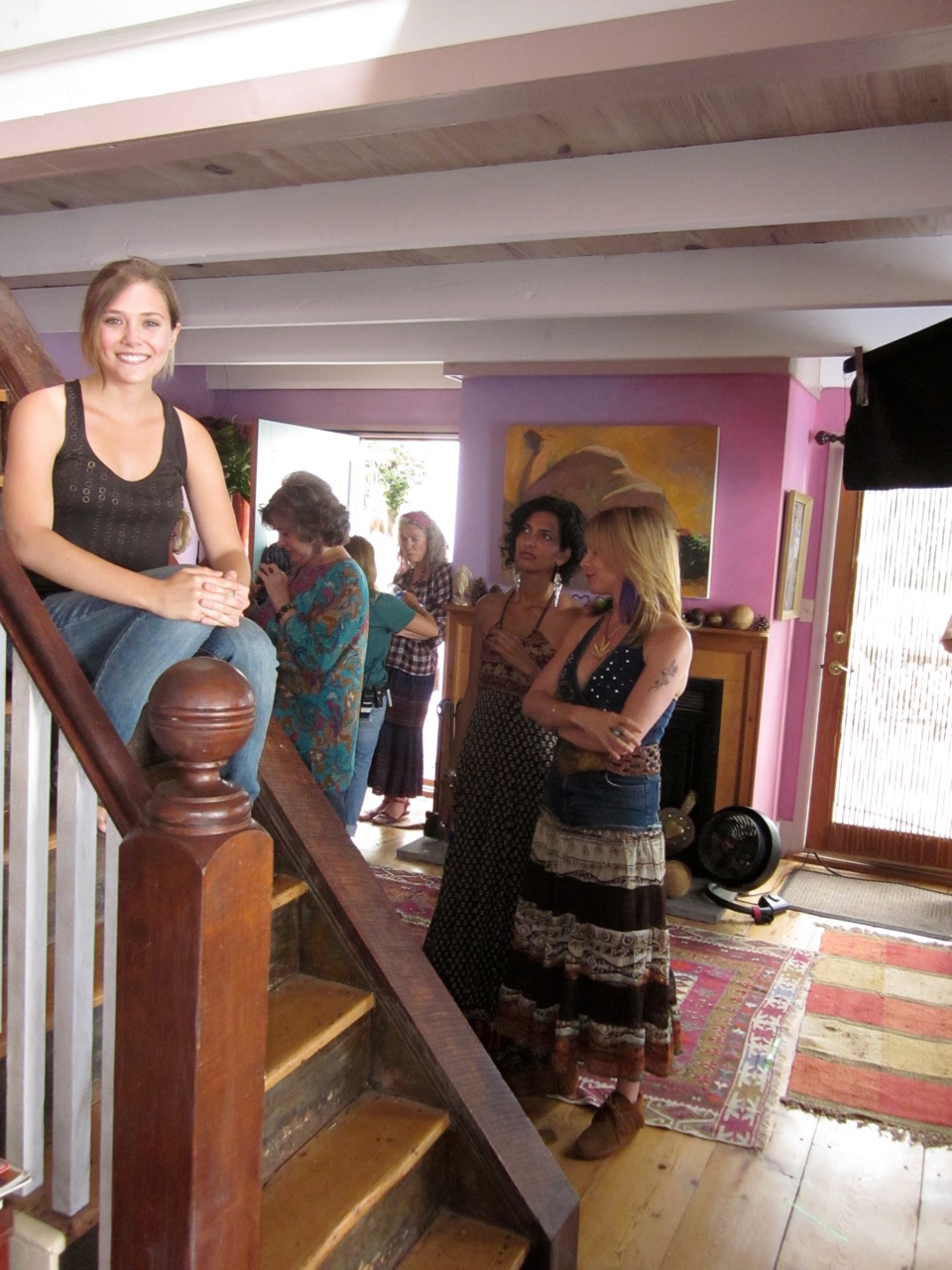 Maddies, Rosanna (Arquette as "Darcy", Poorna and Terry McKenna as "Jasper" preparing to film the party