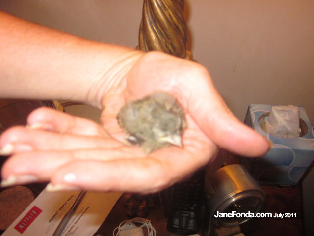 a baby bird fell out of it's nest onto the brick patio. Vanessa knew what to do right away and picked it up.