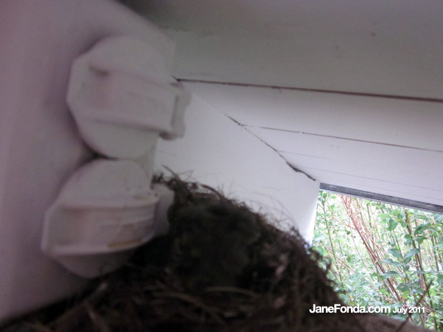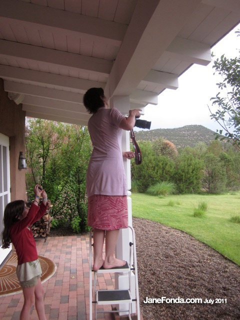 Vanessa putting baby bird back in the nest with Viva taking pictures.