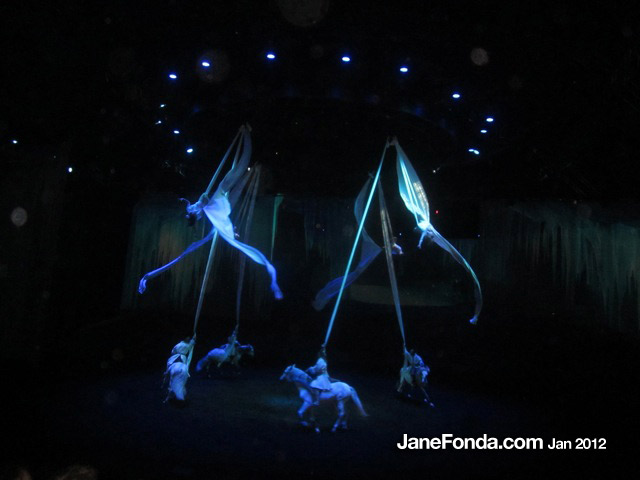 I thought it was even better than the first Cavalia. Not only were there the amazing horses (many breeds, not just the white Arabs shown here though they are my favorite), but extraordinary acrobats, eleven of them from Guinea—all cousins I was told—and a vast, panoramic set that became the steppes of Russia, the plains of Africa, melting snow, many settings that had richness and texture.