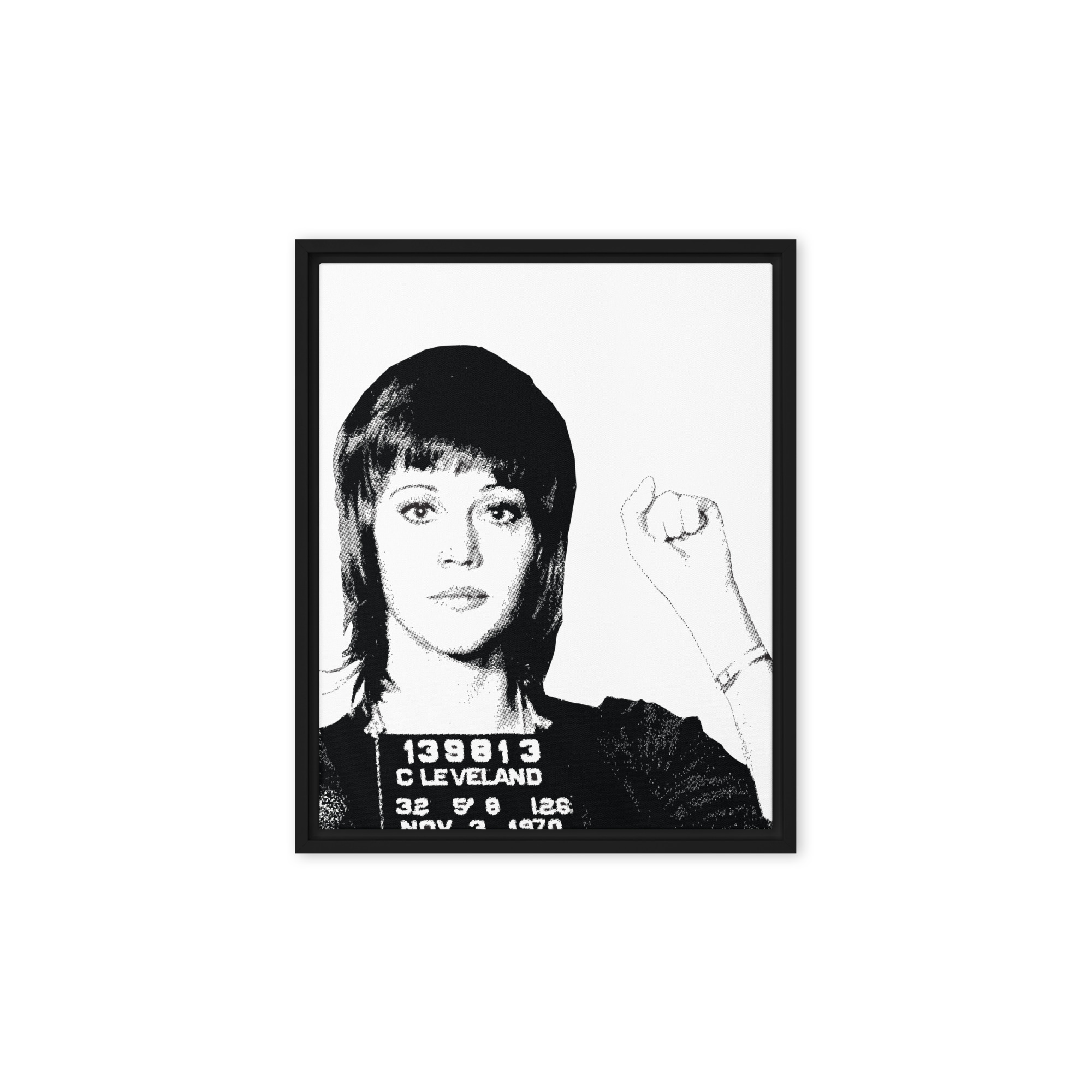 Bring an iconic piece of history into your home with this premium framed canvas featuring Jane Fonda’s unforgettable 1970 mugshot. Printed on high-quality, fade-resistant textured canvas, this artwork is mounted inside a gallery-style floating frame crafted from solid pine wood. The recessed design creates a modern, elevated look that makes the artwork appear to hover within the frame.