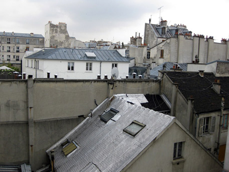 We’re shooting in an apartment within Paris where Pierre and I are supposed to live. We’ll be here all week. I can’t resist taking pictures of interesting roofs. Roofs are so different in different countries. You can tell the class of a particular neighborhood from the roofs. This one is “petit bourgeoisie”–lower middle class. I play a retired philosophy professor and so the 2 of us live on our pensions but it’s an apartment we bought years ago when we were earning more and costs were less.