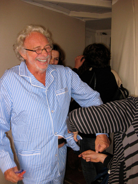 Pierre Richard is one of the most famous and beloved actors in France, known particularly for his comedies. Today we shot our first scene together. He told me he didn’t sleep well last night because he was nervous. Isn’t that sweet? It was a bathroom scene with us brushing our teeth and I lie to him and tell him that my cancer is gone–cured!!